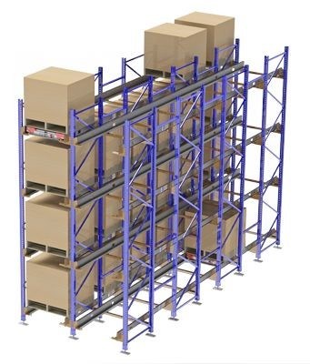 رفوف الدخول/المرور هي نظام (FIFO) أي الوارد أولاً، يخرج أولاً. وهيمناسبة لتخزين كميات كبيرة وأنواع صغيرة من البضائع، ومعدل استخدام مساحة المستودعات مرتفع للغاية. لديها قدرة تخزين تزيد تقريبًا عن ضعف الرفوف ذات العوارض المعتادة في نفس المساحة، وهي مناسبة بشكل خاص لتخزين وحدات البضائع القياسية.