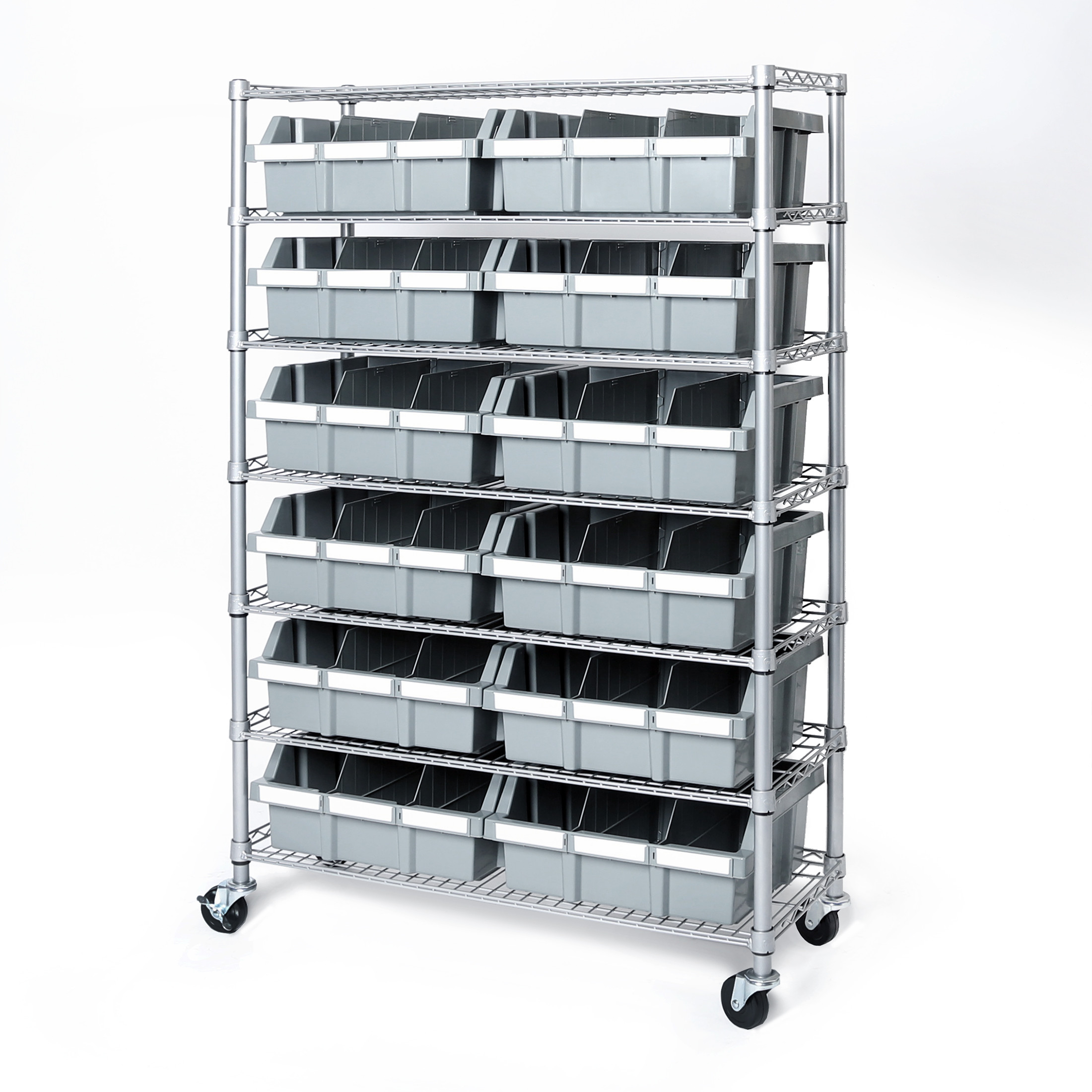 14" D x 42" W x 60" H ؛ 7 مستويات مع 12 علب PP و 4 علب (ثنائي القفل) ؛ 12 علب البولي بروبلين (PP) المستدامة المنزلقة والقفل (12 XL).إجمالي وزن الوحدة على العجلات (توزيعها بالتساوي): 500 رطلاً؛ معدات الغذاء، للمنازل والمطاعم التجارية وبيئات المكاتب